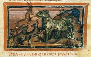 trattava di opere contenenti la descrizione di animali (bestie) sia reali che fantastici, le cui caratteristiche erano interpretate in modo simbolico o allegorico (ad esempio, la pantera, a destra). L'origine dei Bestiari medievali, però, è molto antica. È un testo greco scritto ad Alessandria d'Egitto intorno al II secolo d.C., il Physiologus, nel quale vengono descritti animali e piante (reali e immaginari) e alcune pietre. L'idea di base è che dietro ogni aspetto della realtà concreta si nasconde un significato metafisico, invisibile: saper interpretare il mondo visibile permette perciò di risalire al significato profondo delle cose, nascosto dietro l'apparenza materiale, alla loro essenza. Si tratta di una percezione simbolica della realtà. Questo testo greco è stato tradotto in molte lingue, tra cui il latino. Nella versione latina - di cui il più antico manoscritto conservato risale all'VIII secolo - ci sono molte differenze rispetto all'originale greco: alcuni animali sono eliminati, ma in compenso il testo è ampliato con una serie di informazioni |