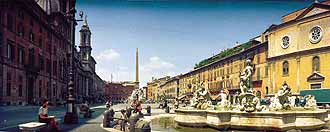 fiancheggia (via dell'Anima). Il papa chiama i fratelli Rainaldi prima, e Francesco Borromini poi, a realizzare un grande palazzo al posto delle costruzioni precedenti e a trasformare la chiesa di Sant'Agnese. Della piazza vera e propria si occupa invece Gian Lorenzo Bernini. L'artista trasforma le due fontane cinquecentesche (una è la Fontana del Moro) e inventa la Fontana dei Fiumi, con l'obelisco sostenuto da una sorprendente roccia traforata: Piazza Navona diventa così un grande circo, con le tre fontane che suggeriscono l'idea della "spina", come nel Circo Massimo. |